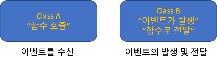 위 그림처럼 class A는 이벤트를 수신하고 class B는 이벤트의 발생 및 전달을 처리한다고 할때, 이와 같은 방법에는 문제가 있다.