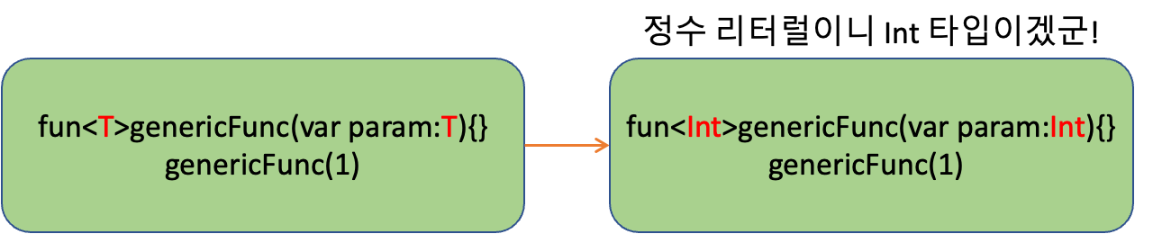 함수에 제너릭을 선언한 경우에는 일반적인 함수처럼 사용하면, 파라미터나 반환형을 통해 타입파라미터를 자동으로 추론하며,