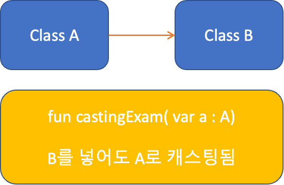 super class인 A 의 자료형으로 받으면 B는 자동으로 A에 캐스팅 되면서 두 클래스 모두 함수의 패러미터로 사용이 가능하다.