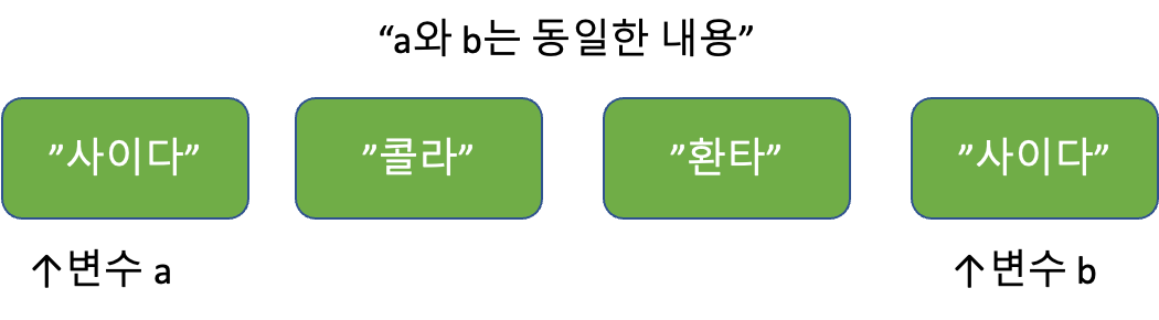 내용의 동일성 은 메모리상에 서로 다른 곳에 할당된 객체라 해도 그 내용이 같으면 동일하다고 판단한다.