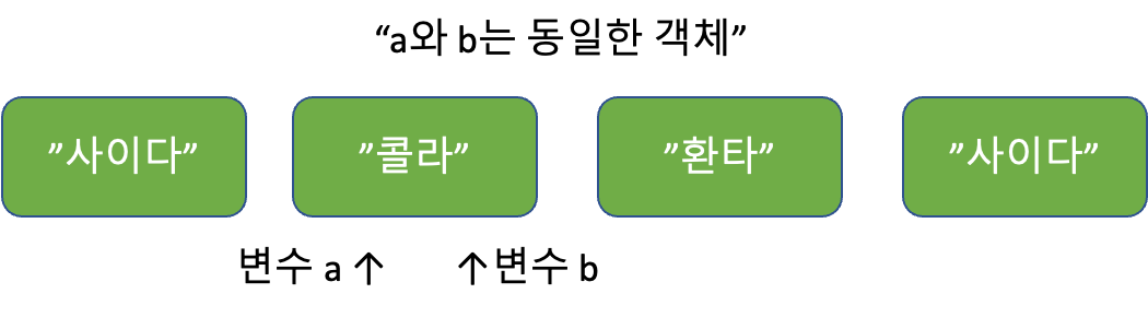 객체의 동일성은 서로 다른 변수가 메모리상에 같은 객체를 가리키고 있을때만 동일하다고 판단한다.
