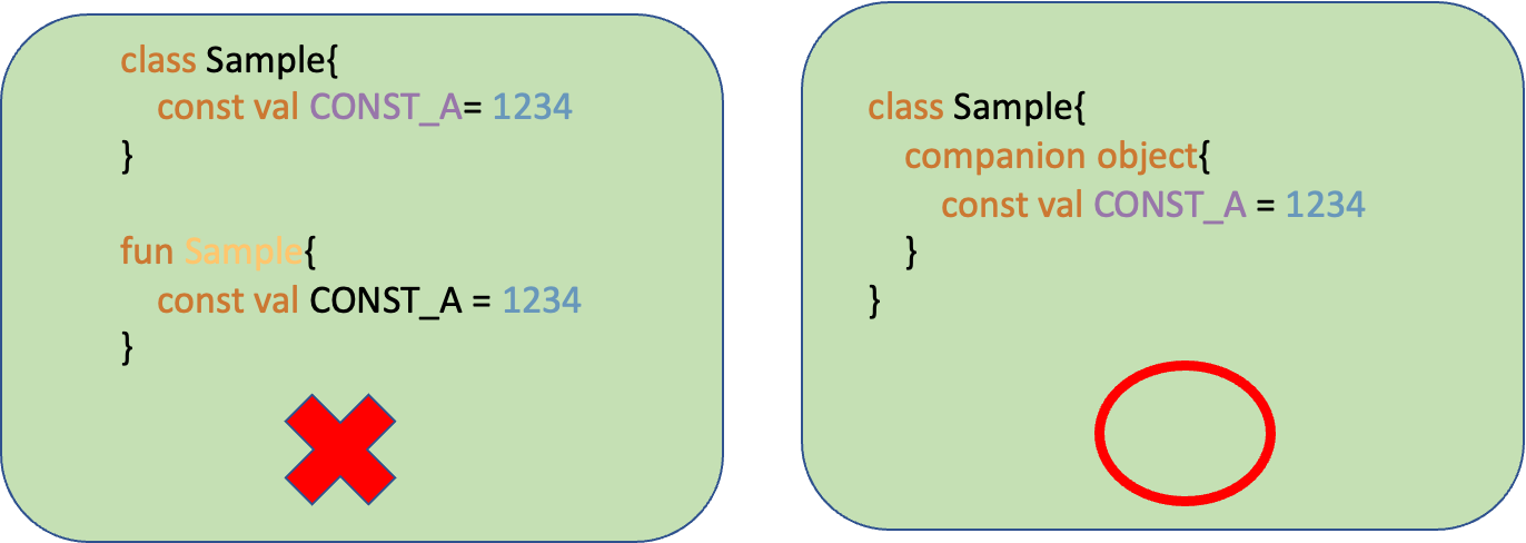 상수는 클래스의 속성이나, 지역변수로는 사용할 수 없으며, 반드시 companion object 안에 선언하여 객체의 생성과 상관없이