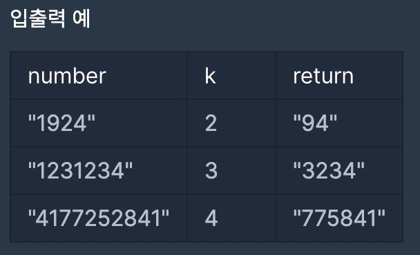 문자열 형식으로 숫자 number와 제거할 수의 개수 k가 solution 함수의 매개변수로 주어집니다. number에서 k 개의 수를 제거했을 때 만들 수 있는 수 중 가장 큰 숫자를 문자열 형태로 return 하도록 solution 함수를 완성하세요.